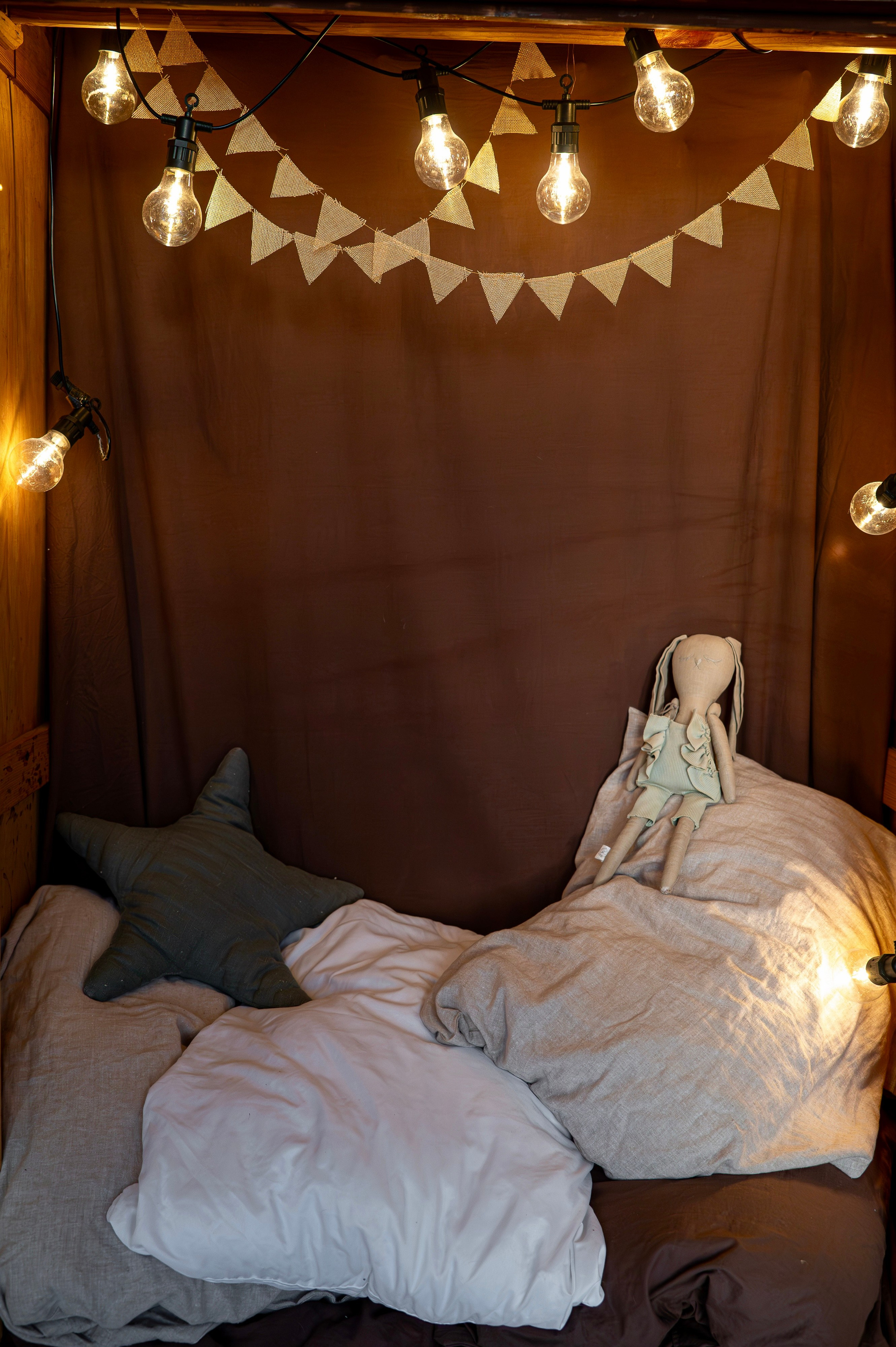В основе — дерево, зелень, коричневые и карамельные оттенки, натуральные ткани и живые ели.